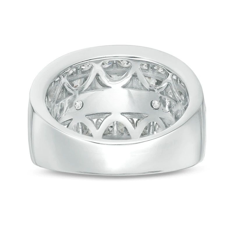 Woo her, wow her and win her with this exceptional three stone diamond ring. Fashioned in 14K white gold, the eye is drawn to the three shimmering round diamonds – the largest an impressive 1/2 ct. – set in perfect alignment across the diamond-lined . Borders of smaller round accent diamonds at the top and bottom of the style add even more radiant sparkle. Punctuated with two small round diamonds is engraved on the inside of the ring shank, a promise to always be by her side. A look she,ll treasure forever, this ring captivates with 4 cts. t.w.
