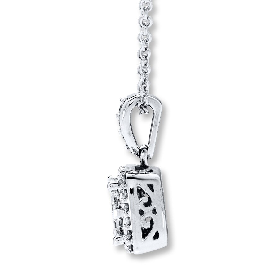 Four princess-cut diamonds are beautifully framed in round diamonds in this gorgeous necklace for her, crafted of 14K white gold. The necklace has a total diamond weight of 1/2 carat. The pendant sways from an 18-inch cable chain that secures with a lobster clasp. From the Four One? Collection.